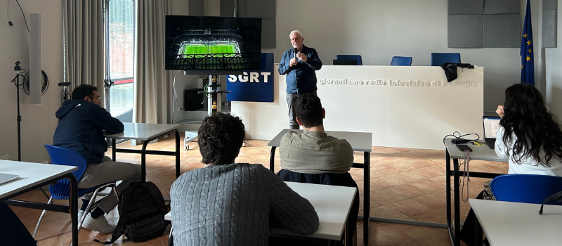 Gli allievi del XVII biennio della Scuola di Giornalismo di Perugia hanno avuto come ospite il giornalista RAI Francesco Repice per un seminario dedicato alla telecronaca, dal titolo “La voce del calcio. Tecnica, ritmo e passione della radiocronaca”.
